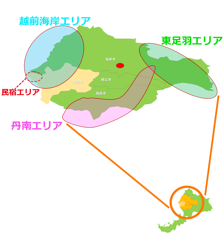 3エリア(丹南、越前海岸、東足羽)※本部ホテルからそれぞれ45分以内の距離にあります。 |